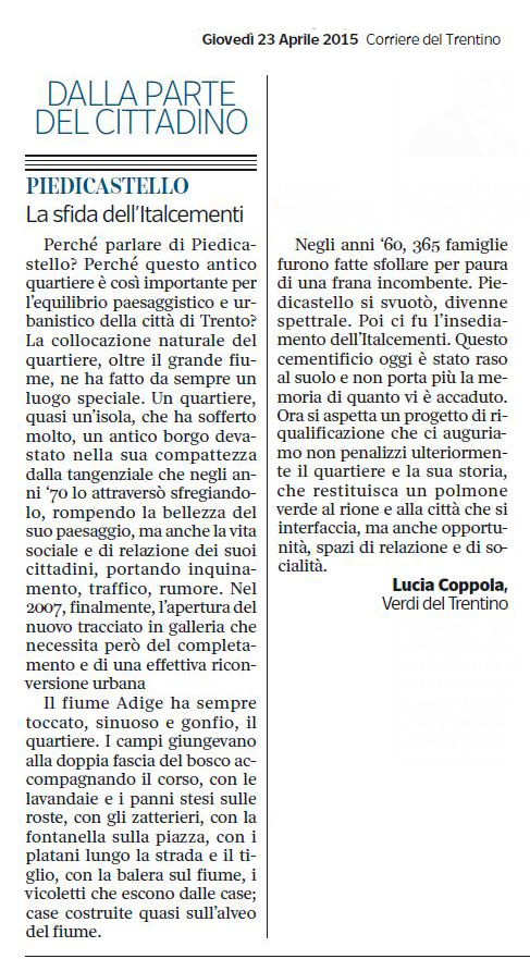 Trento, 20 aprile 2015 Perché parlare di Piedicastello perché questo antico quartiere è così importante per l'equilibrio paesaggistico e urbanistico della città di Trento? Sappiamo che Trento, l'antica Tridentum, si sarebbe sviluppata su un precedente insediamento retico di fondovalle ed è probabile che la presenza di un antico castelliere retico sul Doss Trento, forse utilizzato anche dai romani dopo la conquista, fosse uno dei primi nuclei urbani della città. La città divenne Municipium tra il 50 e il 40 a. C. La lapide murata nella chiesa di S.Apollinare, verso il Lungadige a cui ha dato il nome, con l'iscrizione che attesta l'esecuzione da parte di Marcus Appuleios di un'opera non identificata , su comando dell’imperatore Augusto, risale al 23 a. C.. La chiesa di Sant'Apollinare è un vero e proprio museo, perché contiene anche la lastra di Marco Apuleio e lapidi murate dedicate a Cassidia e all'imperatore Gallieno. La collocazione naturale del quartiere, oltre il grande fiume, ne ha fatto da sempre un luogo speciale, da vivere con modalità differenti rispetto al resto della città, e a cui l'altra parte di città guardava con un misto forse di invidia e ammirazione per la su specificità così immediatamente riconoscibile, per le sue caratteristiche storiche, per le qualità di chi lo abitava e lo abita. Un genius loci che non passa inosservato. Un quartiere, quasi un’isola, che ha sofferto molto, un antico borgo devastato nella sua compattezza dalla tangenziale che negli “anni '70” lo attraversò sfregiandolo, squartandolo, rompendo la bellezza del suo paesaggio, ma anche la vita sociale e di relazione dei suoi cittadini, arrecando danni estetici ma anche colpendo l'anima e la sacralità di questo luogo, portando inquinamento, traffico, rumore. Nel 2007, finalmente, l'apertura del nuovo tracciato in galleria che necessita però del completamento e di una effettiva riconversione urbana. Scriveva Aldo Gorfer, riferendosi allo smembramento: “ La chiesa, costruita dai Benedettini alla fine del XII secolo, probabilmente sui resti della primitiva chiesa dei secoli V è VI, è diventata isola. E così la scuola materna, le scuole elementari, le case operaie. La scuola elementare è stata schiacciata tra la strada sopraelevata ed il cementificio. I pedoni sono costretti a labirinti irrazionali. Più oltre, il paesaggio è una disperata landa di periferia. I gabbiani hanno sostituito i corvi nella caccia ai rifiuti. Gli argini dell'Adige, che erano stati fatti per proteggere i campi dalle ire del fiume, ma ideati in maniera che servissero di paesaggio, sono una sconsolante successione di rifiuti che la presenza dei cantieri comunali non riescono a lenire. Oggi la città è cresciuta a dismisura, il territorio è stato sconvolto. Non c'è tempo per garbate applicazioni che riguardano il rispetto della vita. Piedicastello è stato la vittima della città della quale sorvegliava il castelliere. Il primo assalto si ebbe con la deviazione dell'Adige, ma il borgo mantenne la sua identità. Rinvigorì anzi la sua presenza artigianale. Poi venne il cementificio. La montagna fu aggredita, vi si aprirono ampie ferite, fu sfruttata fino all'esaurimento. Dal fumo delle ciminiere la città pronosticava l'andare del tempo. Ma il fumo era anche polvere di cemento. Il colore dominante di Piedicastello divenne il grigio.” Queste parole, davvero toccanti e amare nella loro realistica descrizione, non possono che ricondurci alla storia di questo quartiere. Con l' Adige che lo lambiva sinuoso e gonfio, con i campi che giungevano alla doppia fascia del bosco che ne accompagnava il corso, con le lavandaie e i panni stesi sulle roste, ognuna aveva il suo posto, con gli zatterieri, con la fontanella sulla piazza, con i platani lungo la strada e il tiglio, con la balera sul fiume, i vicoletti che escono dalle case, le case della fine del secolo costruite quasi sull'alveo del fiume. Le associazioni nautiche erano collegate alla presenza del fiume, c'erano i nocchieri delle zattere per il legname, tipica espressione del borgo. Il fiume parlava con il quartiere e il quartiere lo sapeva ascoltare, nel legame antico che sempre si crea tra coloro che vivono a pieno la presenza di un corso d'acqua. Gli zatterieri si tramandavano il mestiere di padre in figlio, i pescatori rifornivano la città di pesce fresco. Le case operaie di Piedicastello ebbero l'idea iniziale della loro costruzione dalla risolutezza di Paolo Oss Mazzurana, podestà a Trento per ben quattro volte: dal 1872 al 1892. Queste costruzioni cercarono di offrire una prima risposta al problema sociale e civile, sull'esempio di quelle costruite a Schio, anche se la molla iniziale fu l'estromissione dei ceti più poveri dal centro storico per permetterne la ricostruzione e il risanamento. Divenne così un quartiere operaio. Al comune competeva l'innalzamento del livello del terreno per evitare allagamenti e tutte le azioni di bonifica, il costo del terreno, la costruzione di strade e vialetti, l'acquisto della cucina economica. Le case costavano 2150 fiorini. La Società di Mutuo Soccorso subentrò in un secondo momento per regolamentare l'accesso e la costruzione delle case. Il primo conflitto mondiale rappresentò per Trento, come per il resto delle zone di confine, una tragedia di proporzioni immani. Trento passò all'Italia nel 1919, alla fine della Prima Guerra Mondiale. Ma fu la Seconda Guerra Mondiale a lasciare i segni più feroci del suo passaggio; Trento fu bombardata dagli alleati dal 2 settembre 1943 al 3 maggio 1945, per un totale di 40 incursioni che causarono 400 vittime, 200 solo alla Portela, e 1792 edifici danneggiati. Piedicastello soffrì l'affronto della Guerra. Racconta sempre il Gorfer “Coloro che vissero quella giornata di passione conservarono negli occhi e negli orecchi il fumo e le esplosioni , l'argenteo luccicare degli aerei contro il cielo azzurro della tarda estate trentina, era il 2 settembre 1943, l'urlo 