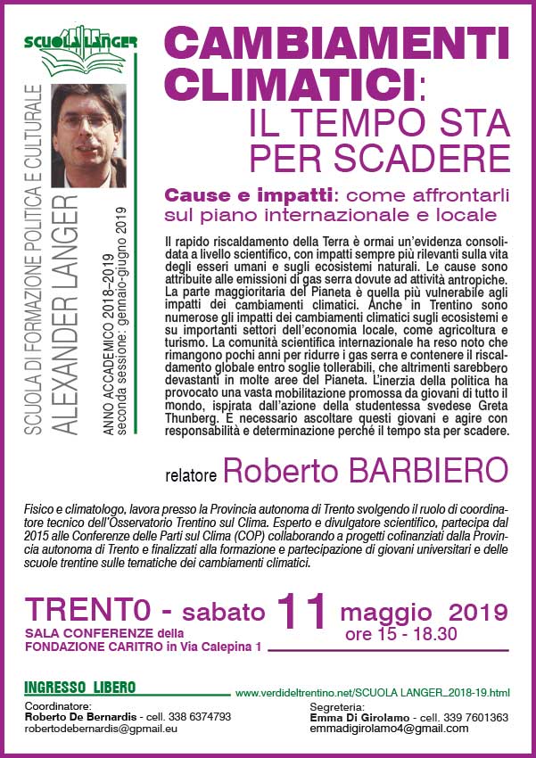 Fisico e climatologo, lavora presso la Provincia autonoma di Trento svolgendo il ruolo di coordinatore tecnico dell’Osservatorio Trentino sul Clima. Esperto e divulgatore scientifico, partecipa dal 2015 alle Conferenze delle Parti sul Clima (COP) collaborando a progetti cofinanziati dalla Provincia autonoma di Trento e finalizzati alla formazione e partecipazione di giovani universitari e delle scuole trentine sulle tematiche dei cambiamenti climatici. |